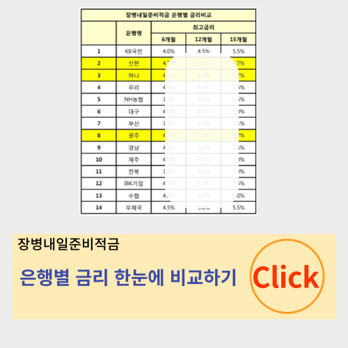 여러상품 비교하면서 고민하고 계신다면, [바로가기] 통해서 국민은행 군적금 상품도 알아보고 확실하게 비교해보세요.